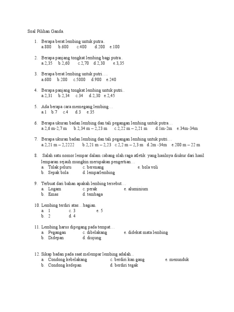 Mata lembing di belakang d. Lembing yang digunakan terbuat dari logam untuk putra beratnya 800 gram dengan panjang 2,70 m, sedangkan putri beratnya 600 gram dengan panjang 2,30 m. Mata lembing di bawah 10. Mata lembing di atas e. Mata lembing di belakang d. Cara membawa lembing sehabis digunakan yang paling baik dan aman adalah … a. Menancapkan lembing mengurangi kekuatan menghindari cedera Latihan soal pilihan ganda bab lempar lembing. Categories contoh soal post navigation. Gerak lanjutan setelah melempar lembing berguna untuk …. Yaitu lempar lembing gaya langkah jingkat dan lempar lembing gaya langkah silang atau biasa disebut : Pernyataan yang benar adalah …. Gerak lanjutan setelah melempar lembing berguna untuk.
