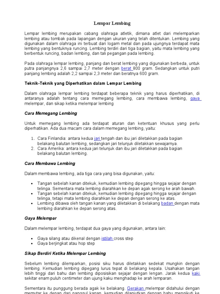 Lempar Lembing from imgv2-2-f.scribdassets.com Cara membawa lembing sehabis digunakan yang paling baik dan aman adalah … d. Cara membawa lembing sehabis digunakan yang paling baik dan aman adalah. Lembing dibawa di belakang badan sepanjang alur lengan dengan mata lembing menghadap ke arah depan serong ke atas. Mata lembing di atas e. Gerakan untuk mendoronf atau melepaskan lembing. Mata lembing di belakang d. Mata lembing di belakang c. A.cara memegang lembing ada dua cara memegang lembing yang banyak digunakan oleh pelempar lembing, yaitu sebagai berikut.