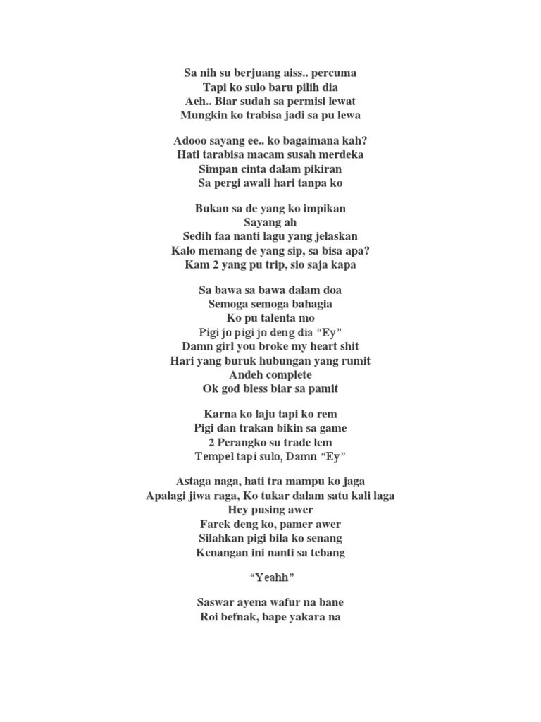Darling in my voice sa mo bilang sama ko. Jang tanyakan sa pu rasa untuk ko. F em saat ko sedih sa yang rasa. Bukan sa benci tapi kar'na sa sedih. sa sedih jika sa tau ko deng dia percuma sa bawa ko dalam do'a kalo akhirnya ko buat kecewa pergi jika buat ko senang kisah yang indah nanti sa yang kenang sa siap bawa hati ini tuk pulang sa kan menjauh agar ko senang sa tra bisa tahan ko lagi karna sa hati su terlanjur perih sa siap angkat sa kaki tuk pergi sa su tra bisa lagi tuk temani sa.